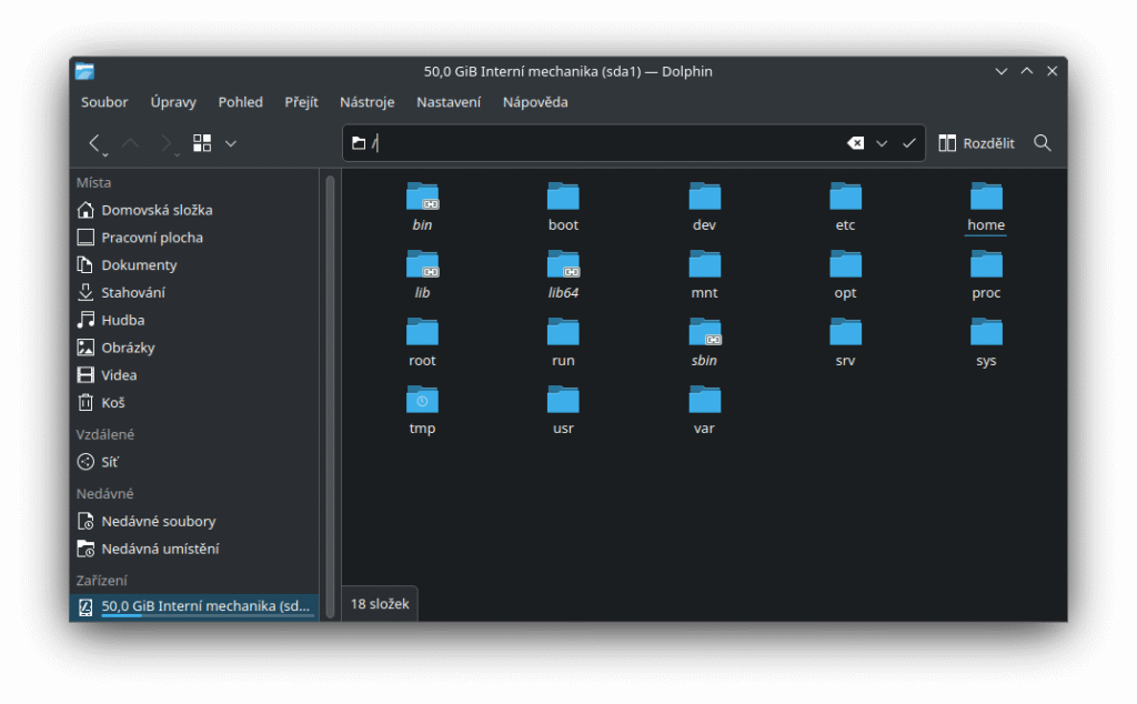 je důležitý pojem a je dobré jej vzít na vědomí, protože v Linuxu panuje řád. Je přesně dáno, kam co patří. Knihovny sem, aplikace sem, uživatelská data sem, atd. Pro nováčka to bude velká změna a je potřeba se s ní sžít. Takže vítejte v prvním informačním šoku, který prostě absolvovat musíte. V nejvyšším adresáři, který se jmenuje kořen (root) a je označen lomítkem /, je několik adresářů, kterými vás nebudu zatěžovat.