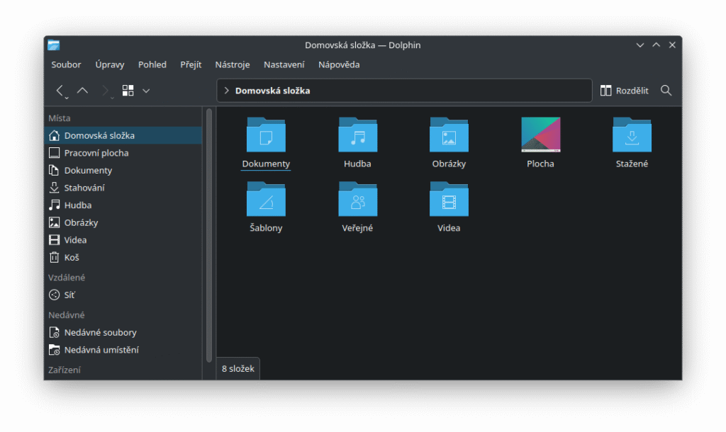 Takto vypadá složka uživatele po čisté instalaci systému (nebo po vytvoření nového uživatelského účtu). Vidíte přednastavené složky, které mají svůj účel. Aplikace pracující s dokumenty automaticky nabízejí ukládat soubory do adresáře dokumenty, multimediální přehrávače pracují s adresáři Hudba a Videa a webový prohlížeč vám nabídne ukládat stahovaný soubor do adresáře Stažené. Jde o funkci nazvanou uživatelské adresáře (XDG user directories). Vidíte i vlevo ve správci souborů jejich nabídku pro rychlý přístup jedním klikem.