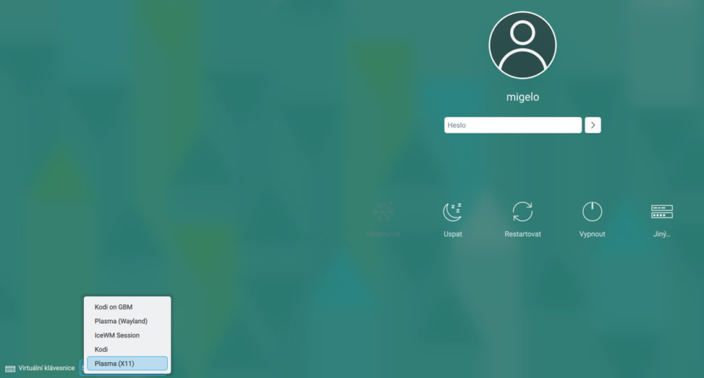 Ukázka dostupných sezení v systému. Pokud nainstalujete více pracovních prostředí, zobrazí se v takovémto seznamu na přihlašovací obrazovce, jako další sezení.